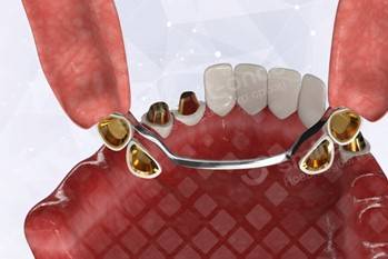 В конструкцию зубного протеза добавляют специальные «отростки» – металлические опоры, поддерживающие каждый зуб, чтобы он не раскачивался в лунке из-за жевательной нагрузки и еще больше не травмировал ткани пародонта.